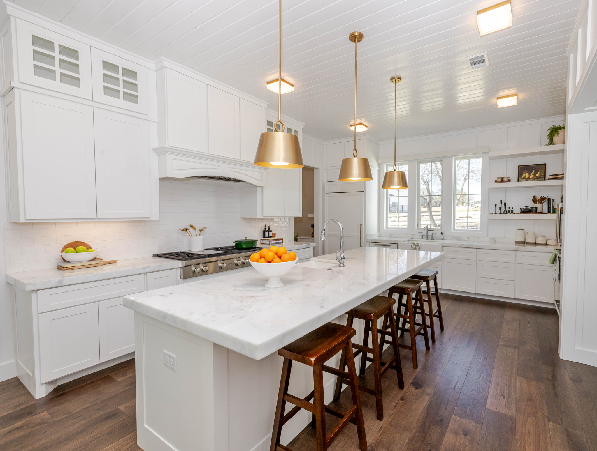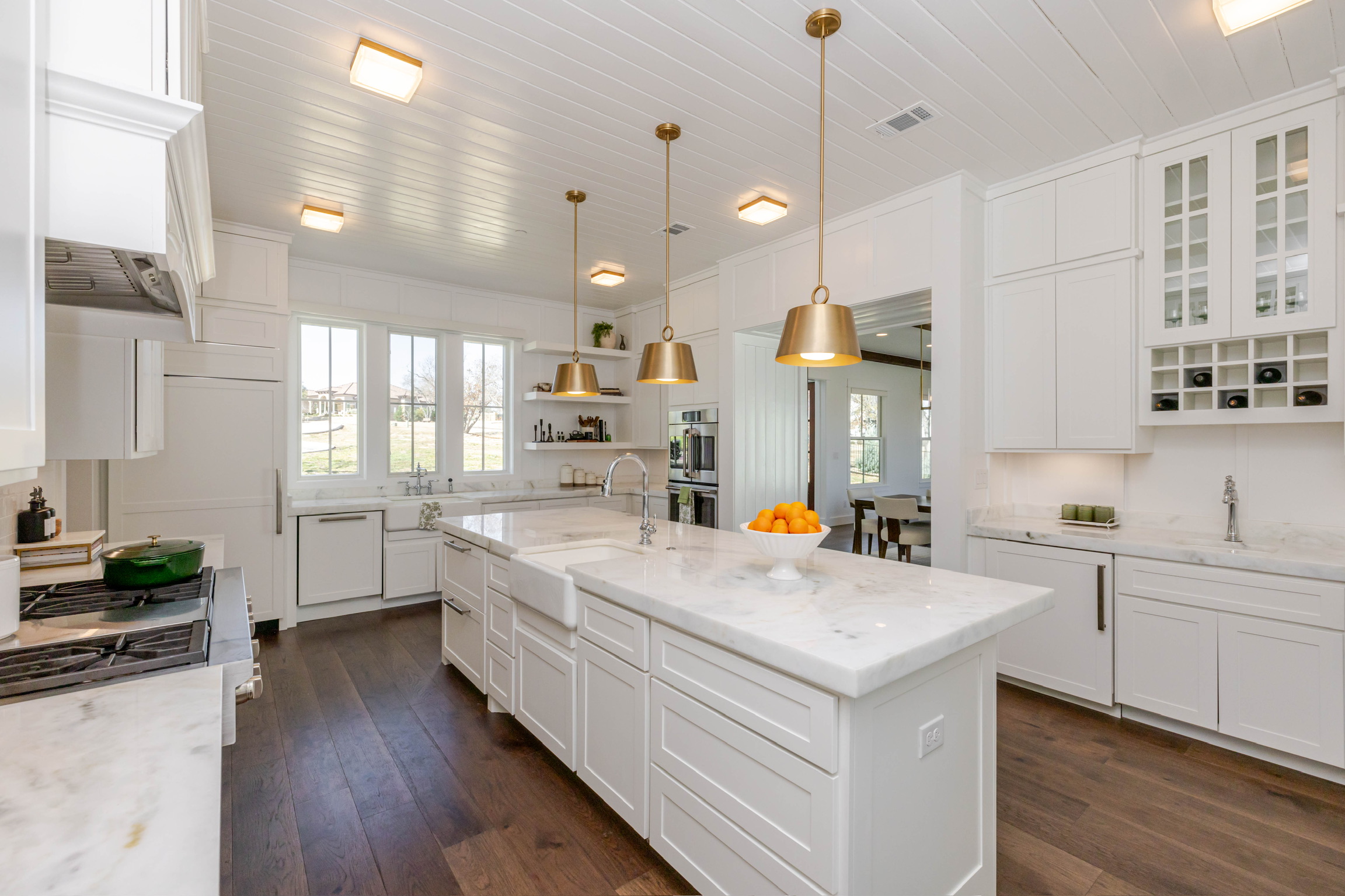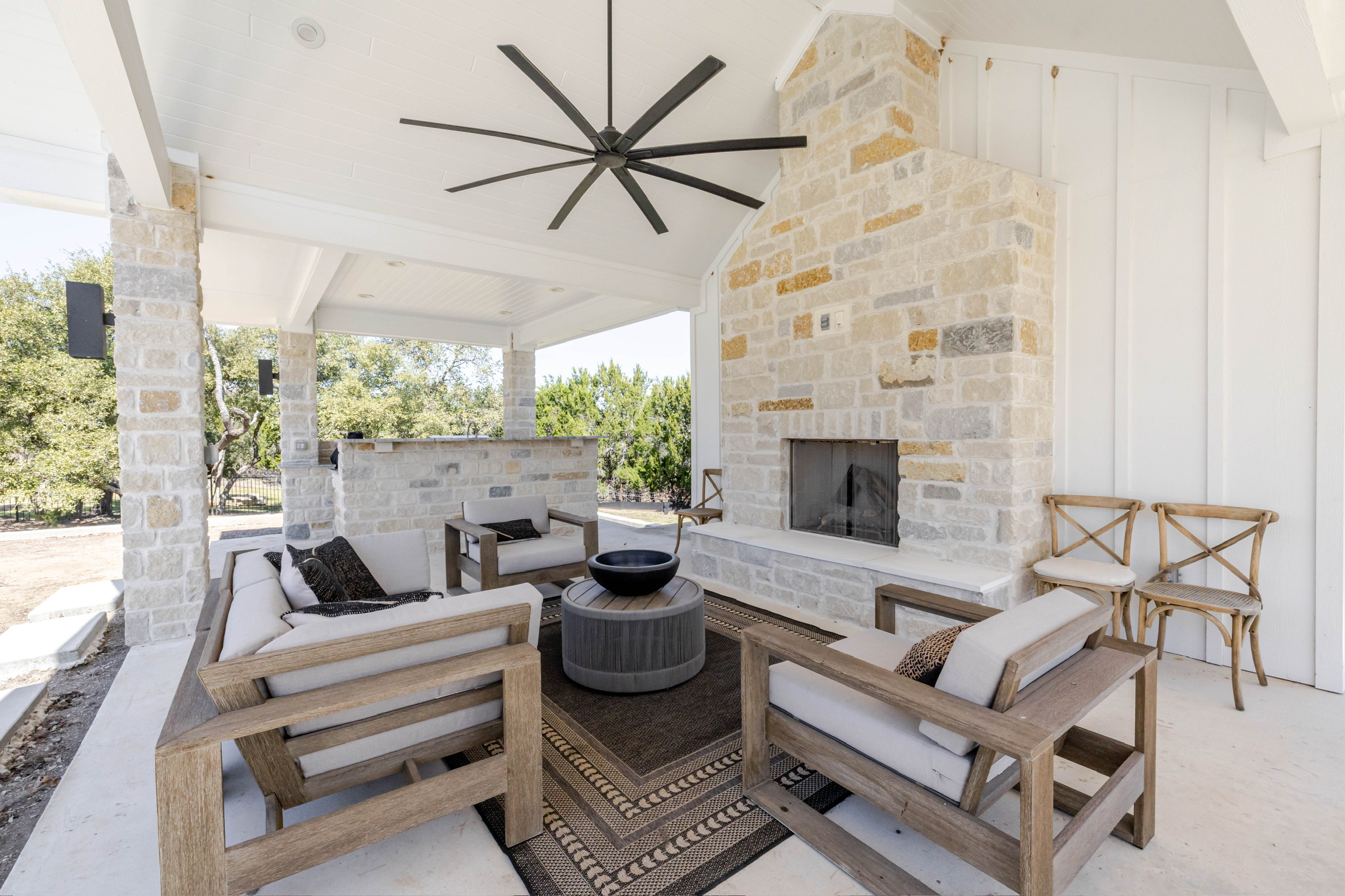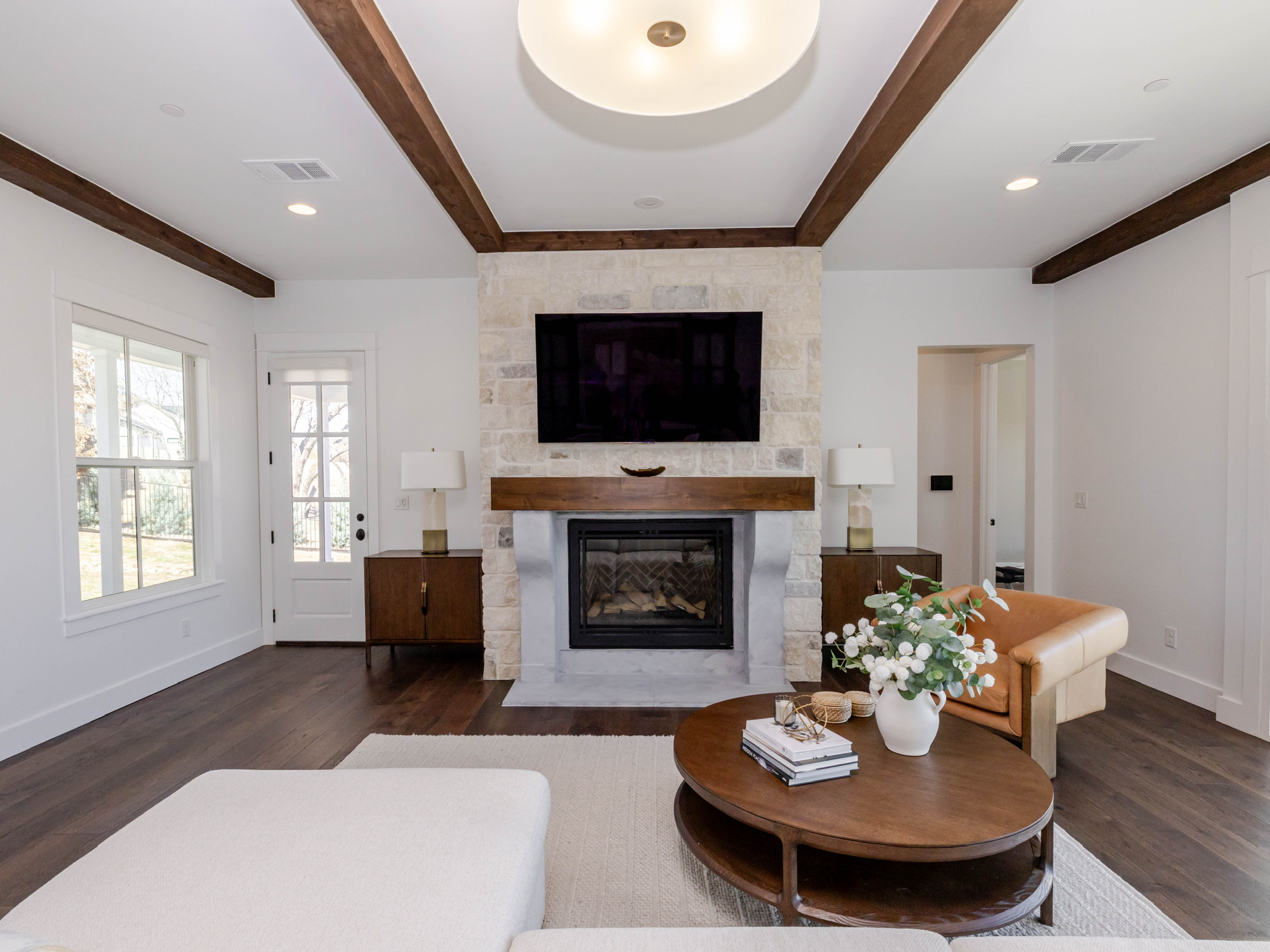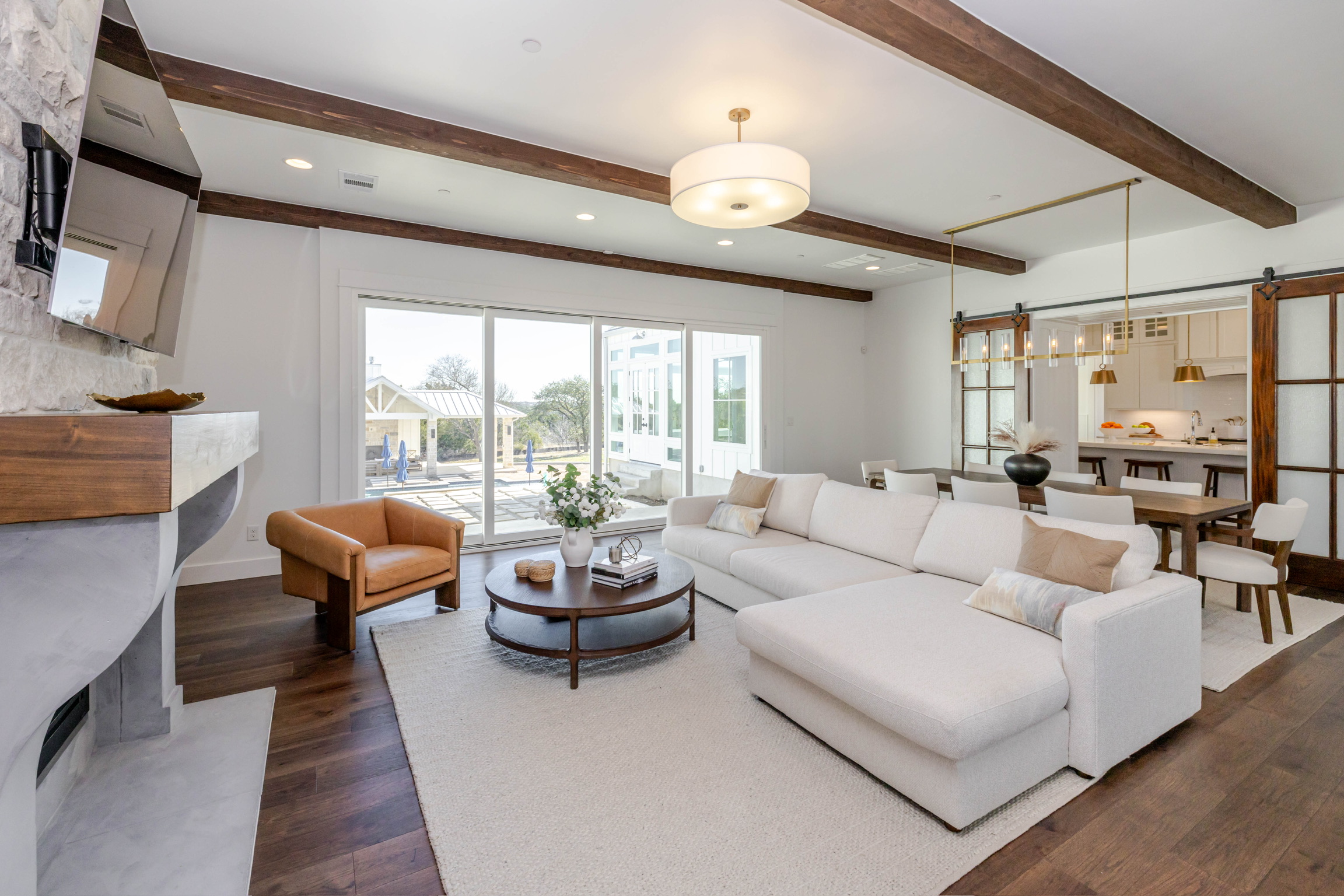 Soaring vaulted ceilings and wood beams that create a warm, grand atmosphere Open-concept layout with a seamless flow between kitchen, dining, and living areas Floor-to-ceiling stone fireplaces that anchor the living spaces with rustic charm Chef’s kitchen with high-end stainless steel appliances, a large island, custom cabinetry, and walk-in pantry Spa-like primary bathroom with a soaking tub, walk-in shower, dual vanities, and expansive walk-in closet Multiple living areas including a media room and formal living room Elegant hardwood flooring and designer lighting throughout Oversized windows for abundant natural light and picturesque views Custom built-ins for storage and architectural detail High-end finishes like crown molding, tray ceilings, and quartz countertops